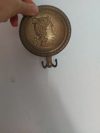 Elegante appendiabiti da parete con un design ispirato all'arte classica. - Profilo decorativo con un volto femminile stilizzato. - Finitura color oro. - Struttura in metallo resistente. - Dotato di due ganci per appendere oggetti.