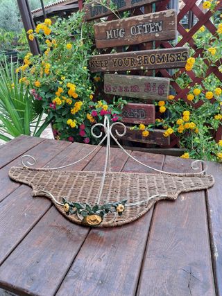 Elegante mensola shabby da parete con una base in vimini intrecciato e dettagli floreali decorativi in metallo. - Struttura in metallo verniciato. - Base in vimini lavorato. - Decorazione floreale in rilievo.