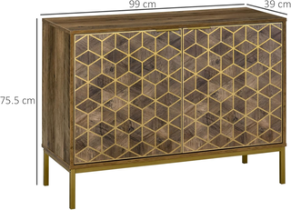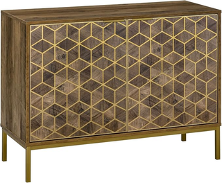 Elegante mobile da ingresso o salotto con un design geometrico unico. - Struttura in legno con finitura effetto anticato. - Dettagli decorativi dorati a contrasto. - Gambe sottili in metallo dorato per un tocco moderno.