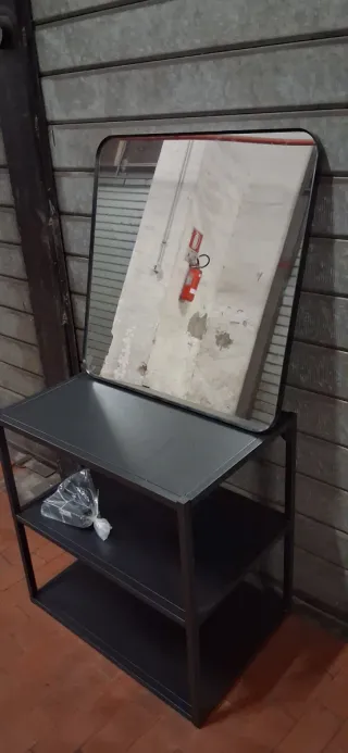 Mobiletto scaffale a 3 ripiani e specchio, entrambi della Ikea. Possono essere venduti anche separatamente. - Struttura in metallo. - Ripiani in materiale effetto pelle. - Specchio con cornice. - Scaffale: 35€ - Specchio: 25€