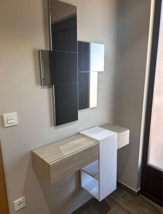 Posso consegnare a Bilbao Elegante mobile da ingresso dal design moderno e funzionale. - Combinazione di finiture in legno e bianco. - Struttura con scomparti aperti e un cassetto. - Design galleggiante e poco ingombrante