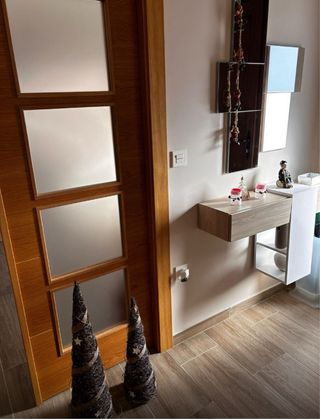 Si vendono tre mobili da bagno di design moderno con finitura liscia. Colore bianco, materiale in legno, acquistati un anno e mezzo fa, venduti per trasloco. 30€ ogni pezzo, 50€ per i due gemelli insieme. 2 mobili sono uguali e uniti per lavabi gemelli, ciascuno con 2 ampi cassetti. Dimensioni esterne: 60 cm larghezza x 30 cm profondità x 63 cm altezza (comprese le gambe). Insieme misurano 121 cm di larghezza. Il terzo mobile è diverso e per un solo lavabo, con una grande porta, un ripiano e 2 cassetti. Dimensioni esterne: 65 cm larghezza x 33 cm profondità x 70 cm altezza.