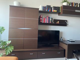 Mobili da soggiorno dal design moderno con finitura in legno. Il secondo mobile che appare nelle foto, quello che non è per la TV, può anche essere appeso. È il tipo di portabottiglie mobile che si blocca orizzontalmente. - Due ampi cassetti con maniglie in metallo. - Superficie liscia e facile da pulire. - Design elegante e allungato.