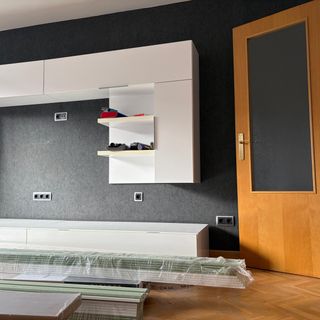 Set di mobili da soggiorno con un design moderno ed elegante. Combinazione di colori grigio e bianco. Materiali vari per un finitura unica. Include mensole e moduli di archiviazione.