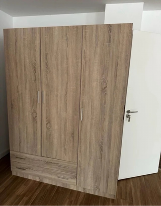 Armadio in legno chiaro di rovere con tre corpi, ideale per camere da letto moderne e funzionali. Offre ampio spazio di archiviazione, perfetto per mantenere vestiti e accessori organizzati. Caratteristiche principali: Colore: rovere chiaro con venature naturali. Dimensioni approssimative: 200 cm di altezza x 150 cm di larghezza x 55 cm di profondità. Tre moduli: zona appendiabiti, cassetti inferiori e ripiani laterali. Porte ribaltabili con cerniere resistenti e maniglie metalliche. Due cassetti ampi di facile apertura. 240€