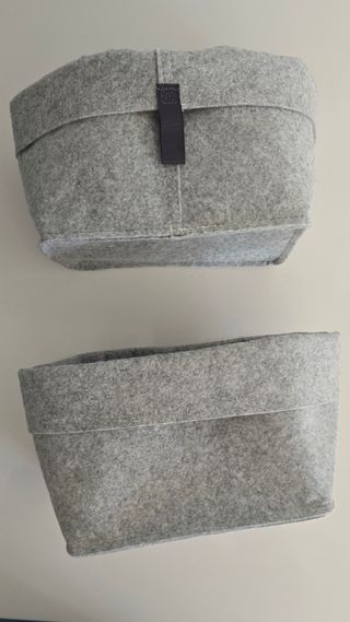 contenitori IKEA in feltro grigio – pieghevoli, stile minimal, come nuovi Vendo 2 contenitori IKEA in feltro grigio, modello NORDRANA (fuori produzione), ideali per organizzare piccoli oggetti in bagno, camera, ufficio o armadio. Materiale morbido ma resistente, facilmente ripiegabili e salvaspazio. Pratici anche per giocattoli, cosmetici, accessori, cavi o cancelleria. Condizioni: Usati pochissimo, in ottime condizioni, senza macchie né segni d’usura. Dimensioni (approssimative): Altezza: regolabile piegando il bordo Larghezza: 25 cm Profondità: 15 cm Colore: grigio chiaro Materiale: feltro sintetico