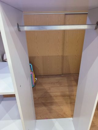 Guardaroba a due ante con un design infantile ed elegante. Perfetto per organizzare vestiti e giocattoli. Ha una barra per appendere gli abiti e due ripiani (uno inutilizzato). - Finitura bianca. - Maniglie rotonde. - Struttura in legno.