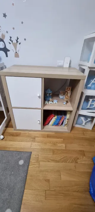 Scaffale modulare con un design moderno e funzionale. In perfetto stato. Il ritiro è a carico dell'acquirente. Non effettuo spedizioni. Combina finiture in legno e bianco. Ideale per organizzare giocattoli o libri.
