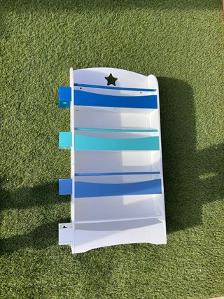 Scaffale dal design moderno per camera dei bambini o adolescenti. Perfetto per organizzare libri e giocattoli. Struttura bianca con dettagli in blu e turchese. Design con stella decorativa nella parte superiore.