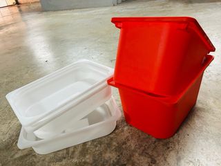Due scatole di plastica bianche per la conservazione. Ideale per organizzare qualsiasi spazio. Sono robusti e facili da pulire. - Sono in buone condizioni. - Perfetti per riporre vestiti, giocattoli o altri oggetti. - Hanno coperchi. Sono stati utilizzati come magazzino per vestiti e cibo in un camper. Sono in ottime condizioni e possono essere puliti molto bene e facilmente con quei prodotti che vedete nella foto. 10€ uno, ne abbiamo 4 se li prendi tutti e 4 c'è uno sconto. grazie