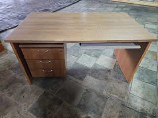 Scrivania di colore marrone, con cassettiera a 3 tiretti e postazione a scorrimento per tastiera computer
