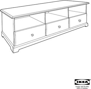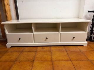 Mobile TV della serie Liatorp di Ikea, dal design classico e funzionale. Perfetto per organizzare il tuo spazio multimediale. - Tre vani a giorno superiori. - Tre cassetti con maniglie discrete. - Struttura robusta e finitura liscia.