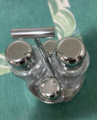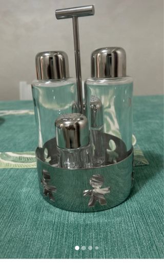 Elegante set per olio e aceto Alessi, perfetto per la tavola. - Contenitori in vetro trasparente. - Dettagli e struttura in metallo argentato. - Design moderno con decorazioni a forma di omino stilizzato.