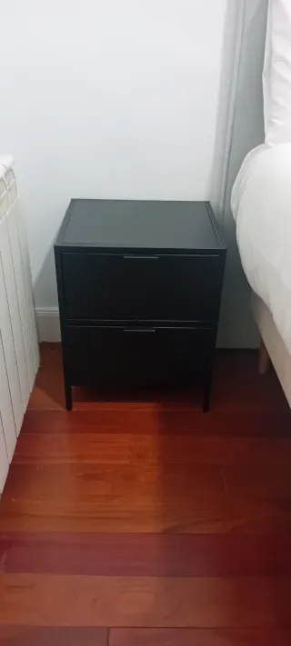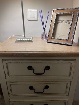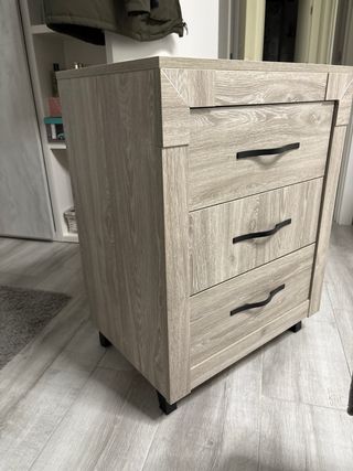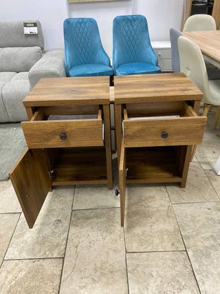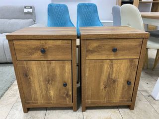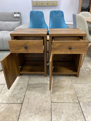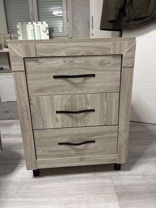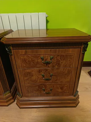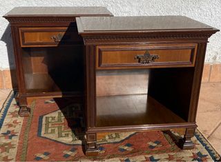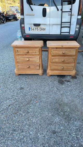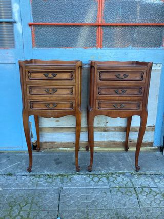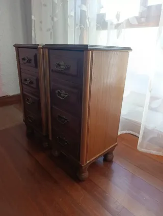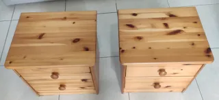 Conjunto de dos mesitas de noche de madera. Se venden juntas o por separado. - Diseño clásico y funcional. - Acabado en tono marrón cálido. - Cada mesita cuenta con tres cajones. - Tiradores redondos a juego. 20€ unidad y 35€ las dos