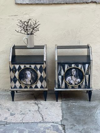 Coppia di comodini vintage con un design unico. - Decorazione a rombi in stile Arlecchino. - Dipinti con ritratti circolari. - Gambe affusolate nere. - Cornici decorative in bambù dorato
