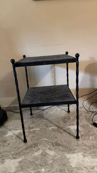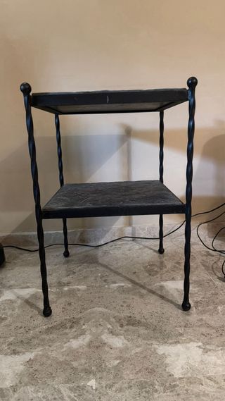 Set di due tavolini ausiliari dal design elegante. Prezzo per coppia 120€ - Struttura in ferro battuto. - Superfici in pietra. - Colore nero e grigio. - Adatti per qualsiasi ambiente.
