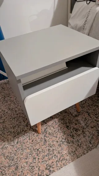 Set di due comodini dal design moderno e minimalista. - Finitura bianca lucida e grigia. - Gambe affusolate in legno chiaro. - Cassetto estraibile. Dimensioni: 50x34x40 cm Uno dei due si presenta leggermente scolorito come da foto