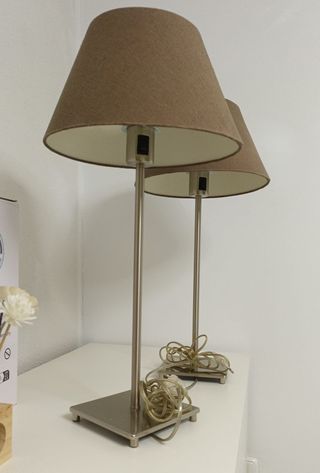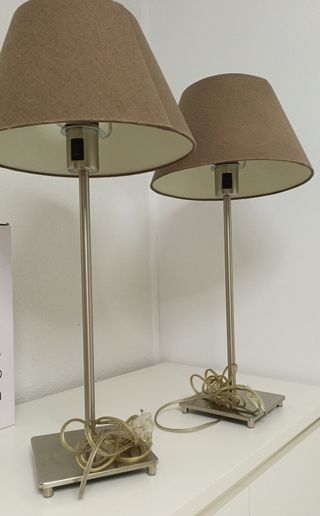 Coppia di lampade da tavolo dal design sobrio ed elegante. - Struttura in metallo satinato - Schermi in tessuto - Interruttore integrato - Funzionano perfettamente Ideali per comodini, soggiorno o ufficio. Design neutro e senza tempo, facile da integrare in qualsiasi ambiente. - Schermi in tessuto color marrone. Misure: Basi di 15x15cm, schermi di 29cm di diametro e 60cm di altezza