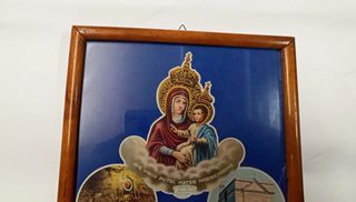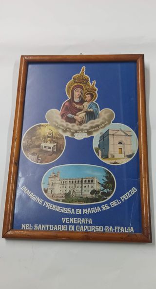 Quadro con stampa raffigurante la Madonna del Pozzo, venerata nel Santuario di Capurso. - Immagine prodigiosa di Maria SS. del Pozzo. - Testo Ave Virgo Putai, Mater Misericordia. - Raffigurazioni del Santuario e di scene sacre. - cornice in legno. Buone le condizioni. Le sue misure: 24x35x2