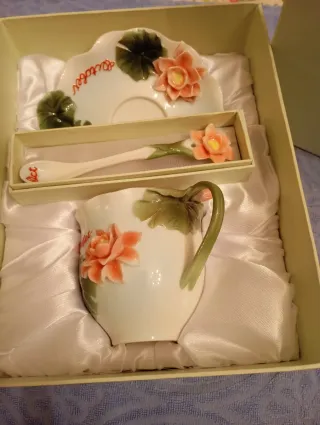 Elegante set composto da tazza, piattino e cucchiaino, decorato con fiori e foglie. LA NINFEA Tazza da collezione con piattino e cucchiaino OTTOBRE . La Ninfea è un meraviglioso fiore acquatico. E’ profumato e particolarmente decorativo. Il fiore di Ninfea può superare anche i 10 cm di diametro e sbocciano all’alba per chiudersi al tramonto. La pianta di Ninfea fiorisce da maggio a settembre. In Inghilterra la Ninfea viene chiamata Giglio d’acqua. Nel linguaggio dei fiori il significato della Ninfea è purezza e castità, proprio come il Giglio.