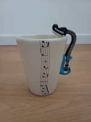 Tazza in ceramica con un design musicale unico. - Decorata con note musicali. - Manico a forma di chitarra elettrica blu.