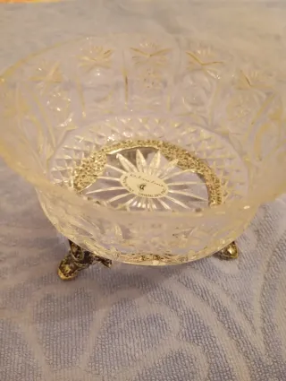Elegante ciotola in cristallo, perfetta per servire cioccolatini o caramelle. - Realizzata in cristallo 24% Pb. - Base e piedini decorativi in metallo. - Design inciso con motivi floreali e a stella. Diametro cm 12
