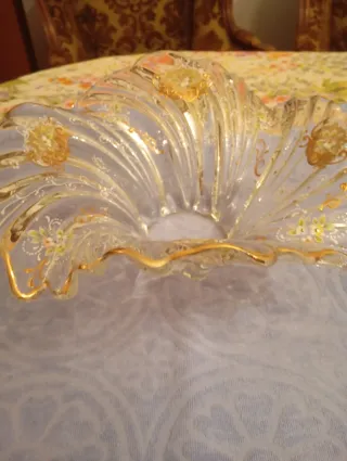 Elegante centrotavola in cristallo trasparente con bordi dorati e delicati decori floreali dipinti a mano. - Materiale: Cristallo - Colore: Trasparente con dettagli oro e colori pastello - Design: Bordo ondulato e decorato