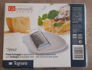 Piatto formaggio in porcellana con grattughia in acciaio inox. Tognana. Nuovo