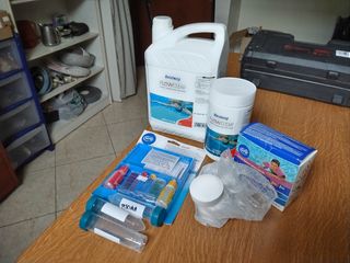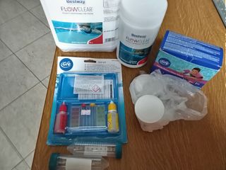 Accessori per la pulizia e gestione dell'acqua della piscina: 5 pastiglie da 100gr l'una multifunzione (cloro,flocculante,stabilizzante,antialga) marchio CRE+kit per analisi chimica boro/cloro/pH (mai aperto) marchio CRE+ fusto da 5L di flocculante Bestway flowclear (usato pochissimo praticamente pieno)+barattolo da 1kg di cloro in granuli Bestway flowclear (usato pochissimo praticamente pieno). Vendo per dismissione piscina