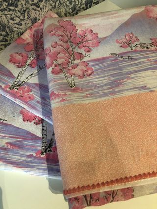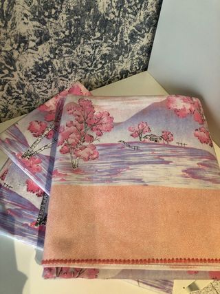 Tovaglia per tavolo rotondo con un motivo a quadretti rosa e azzurri, con dei fiori al centro. Diametro: 1,70m