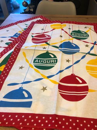 Set di strofinacci con un allegro tema natalizio. 46x66cm - Fantasia con albero di Natale, candele e stelle. - Bordatura rossa con stelline bianche. - Scritta Auguri in giallo e rosso.