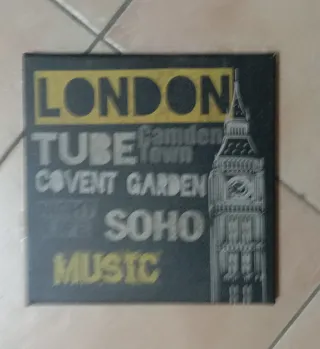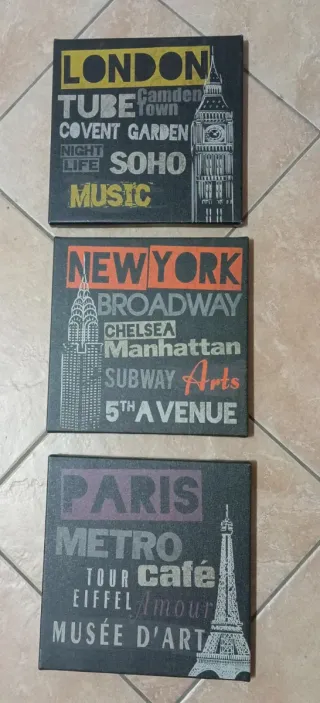 Set di tre quadri decorativi con stampe di città. - Stampa London con Big Ben. - Stampa New York con Chrysler Building. - Stampa Paris con Torre Eiffel.