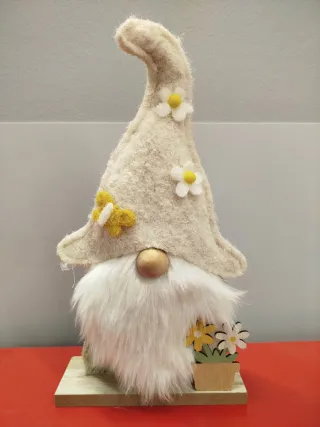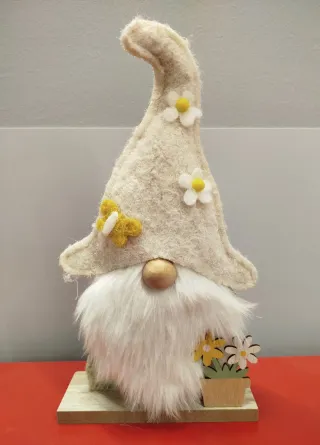 Adorabile gnomo decorativo, perfetto per aggiungere un tocco primaverile alla tua casa. Realizzato con cura per un aspetto unico. - Cappello beige con fiori bianchi e gialli. - Dettaglio di una farfalla gialla sul cappello. - Barba bianca folta. - Base in legno con un piccolo vaso di fiori. Altezza cm 34.5