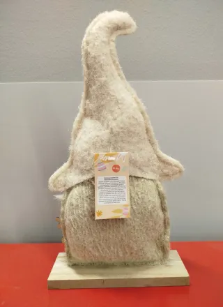 Adorabile gnomo decorativo, perfetto per aggiungere un tocco di allegria alla tua casa. Realizzato con cura, presenta dettagli che richiamano la primavera. - Cappello con applicazioni di fiori e farfalla. - Barba folta e morbida. - Base in legno con vasetto di fiori decorativi. Altezza cm 34.5