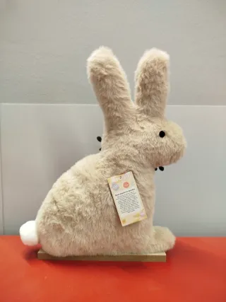 Grazioso coniglio decorativo, perfetto per aggiungere un tocco primaverile alla tua casa. La base in legno assicura stabilità. - Morbido tessuto beige. - Dettagli floreali colorati sul collo. Altezza cm 37