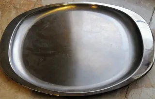 Vendo vassoio ovale integro e senza bozzi usatoa in ottime condizioni , qualche lieve segno di usura marca Alfra Acciaio Inox 18 8. Capiente e resistente con una bella lucidata farete un figurone . larghezza 46cm , altezza 32.