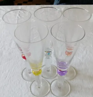 Elegante set di cinque flute per spumante, perfetti per ogni occasione speciale. Ogni bicchiere presenta un tocco di colore distintivo alla base dello stelo. - Design moderno e raffinato. - Base colorata per un tocco vivace. - Ideali per brindisi e celebrazioni. Un bicchiere presente una lieve scoloratura ma può essere ridipinto.