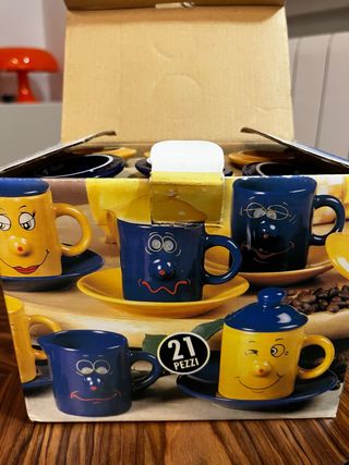 Set completo di 21 tazzine da caffè vintage, risalenti agli anni '90. Un tocco di allegria e originalità per la tua tavola. - Design unico con faccine simpatiche. - Colori vivaci blu e giallo. - Realizzate in ceramica.