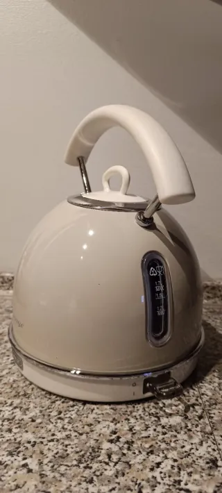 Elegante bollitore elettrico in stile vintage, colore beige. - Capacità massima 1.7L. - Indicatore livello acqua. - Base girevole a 360°. - Elemento riscaldante nascosto.