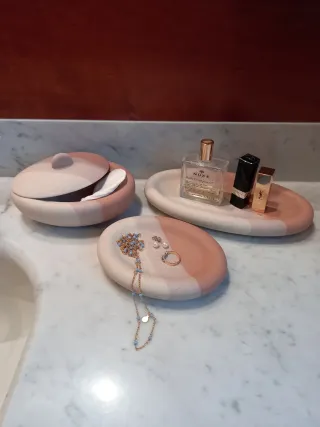 Set bagno ceramica e pietra. Ottime condizioni. Utilizzabile come porta dischetti di cotone / portagioie / svuota tasche ecc. In materiale tipo ceramica sabbiata. Colore panna albicocca rosa. #portagioie #setbagno #portadischettitrucco #accessoribagno #accessoribagnoeffettopietra #svuotatasche