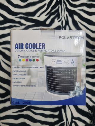 Air cooler Polartech. Umidificatore e purificatore d'aria portatile. Cromoterapia con 7 modalità di colore. Capacità serbatoio 500 ml. Caricatore usb incluso. Filtro lavabile. 3 velocità. Nuovo in confezione originale.