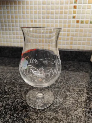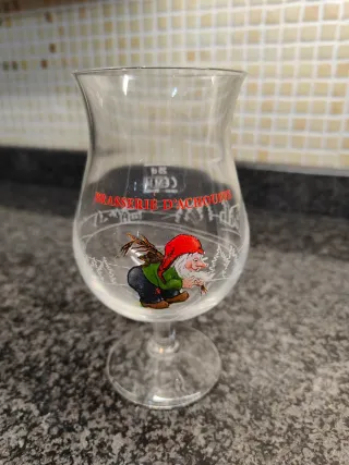 Bicchiere in vetro con decorazioni. - Design con personaggio e alberi. - Scritta BRASSERIE D'ACHOUFFE in rosso.