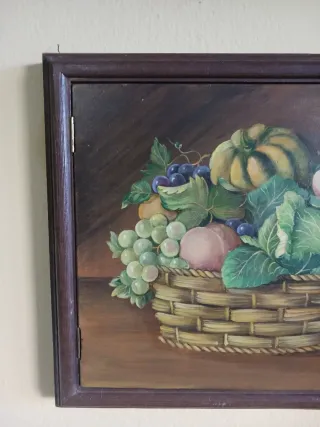 Quadro decorativo con sportello, ideale per coprire una cassaforte o vano celato dietro e come elemento d'arredo. - Misure 50x43x5 - Raffigurazione di un cesto di frutta e verdura dipinto. - Cornice in legno scuro. - Maniglia rotonda in legno.