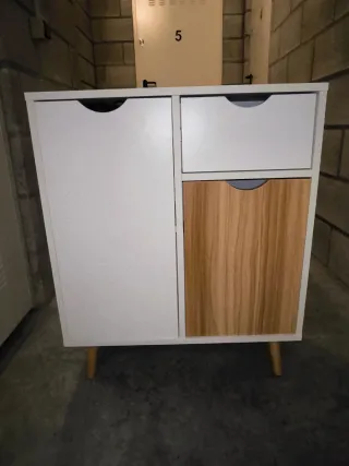 Mobile buffet con due ante, ideale per cucina o terrazza. Design moderno e funzionale. Finitura in legno e bianco. Con ripiano centrale. Mobile pratico. Piano in legno chiaro tipo encimera. Ha solo un piccolo taglio su un ripiano. Vedi foto. Per il resto è ben conservato.