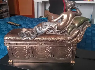 Elegante portagioie in stile classico, raffigurante una dea greca sdraiata su un divano. - Design dettagliato e raffinato. - Finitura effetto bronzo antico. - Ideale per conservare gioielli e piccoli oggetti preziosi.