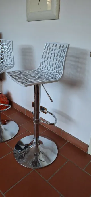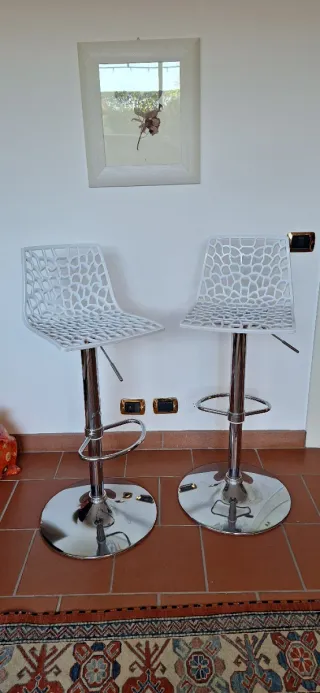 Elegante coppia di sgabelli con un design moderno e accattivante. - Seduta in plastica bianca traforata. - Struttura e base in metallo cromato lucido. - Altezza regolabile.