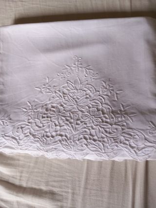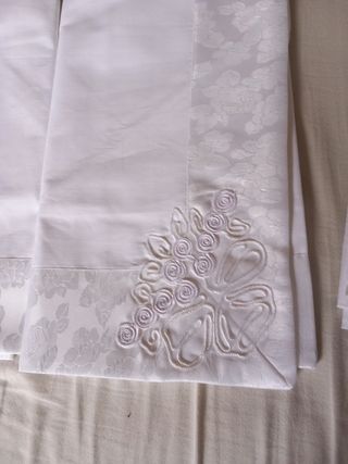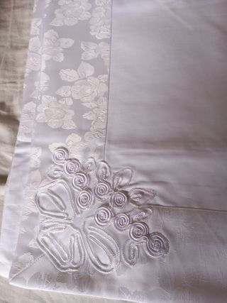 Bellissimo completo di lenzuola matrimoniali, in cotone e raso, dal colore bianco. Sono in ottime condizioni. - Perfette per una camera da letto elegante e raffinata. - Ricamo floreale nei bordi.
