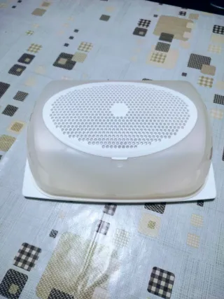 Pratico contenitore Tupperware per conservare il formaggio. Usato solo due volte, è come nuovo. Non ci sono difetti. - Design ovale con coperchio traforato. - Base bianca e trasparente.