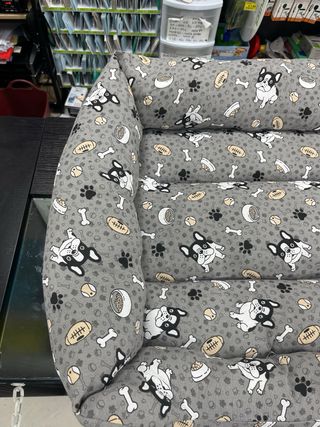 Morbida cuccia per cani o gatti con una simpatica fantasia. - Fantasia con bulldog francesi, ossa e palloni. - Bordi rialzati per un maggiore comfort. 80x60 nuova con etichetta