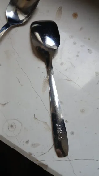 Set di sette cucchiai di metallo. Sono ideali per l'uso quotidiano. Si trovano in buone condizioni, con alcune normali segni d'uso. - Sette cucchiai in totale. - Design classico ed elegante. - Perfette per caffè, tè o dessert.